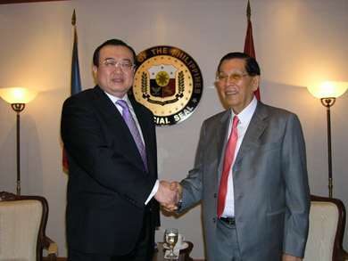 恩里萊對劉建超到任表示熱烈歡迎,并請劉建超轉(zhuǎn)達對吳邦國委員長和賈慶林主席的問候。他表示,菲中兩國人民的友好交往歷史悠久,菲律賓視中國為友好鄰邦和重要朋友,菲方愿與中方一道推進兩國政治、經(jīng)貿(mào)關(guān)系向前發(fā)展。