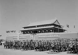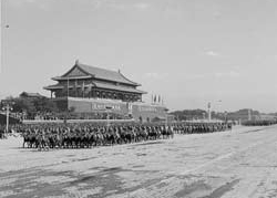 阿木古楞:受閱壓力很大,覺得在天安門接受毛主席檢閱,比打錦州沖鋒陷陣還緊張啊。記得閱兵總指揮楊成武在會上對各部隊指揮員說,誰的馬驚了,就撤團長的職。我們真擔心出岔子啊。部隊訓練很刻苦,士兵很下功夫。在北京駐訓時正是炎夏,北京熱呀。我們騎兵常年駐在草原,涼快慣了,熱得人和馬都受不了。我們每天早上4時起床,5時就開始訓練,練到10時才休息,下午接著練,一直練到黃昏。特別是馬不好練。我們的馬都是從戰(zhàn)場上下來的,打仗可以,騎手雙腿一夾,馬撒腿就往上沖,現在不行,必須步伐整齊。要踩著音樂,跟上拍子。