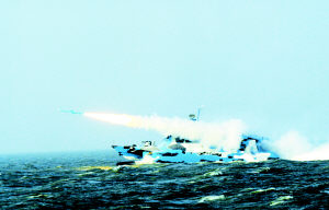 “嗖”的一聲巨響,艦艇輕微地抖動(dòng),官兵們心里“噔噔”直跳。導(dǎo)彈拖著長(zhǎng)長(zhǎng)的尾焰向遠(yuǎn)海飛去。首發(fā)命中!