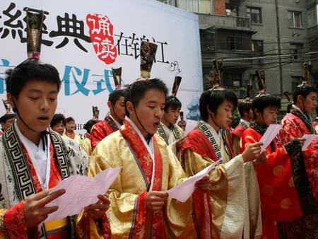 “龍之傳人,天命東方。列祖賜我光榮,蒼天降我大貴。弱冠既加,如之棟梁。道義不辭,大任始承……”3月26日,十八名身穿漢服的成都青年當(dāng)眾完成漢代成人禮,而錦江區(qū)國學(xué)經(jīng)典誦讀活動亦隨即啟動。四川新聞網(wǎng)記者獲悉,為倡導(dǎo)轄區(qū)內(nèi)機關(guān)干部爭讀國學(xué),錦江區(qū)公開發(fā)出倡議,號召全區(qū)機關(guān)干部每天關(guān)閉電視或電腦一小時,把時間用于學(xué)習(xí)國學(xué)經(jīng)典。