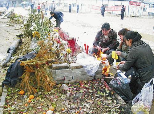 馮慧和她的姐姐、侄女,在“三道拐”處擺上水果、酒等祭品,為她們在地震中遇難的5位親人祈禱。