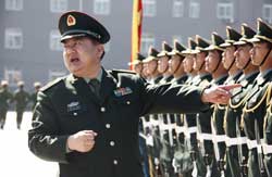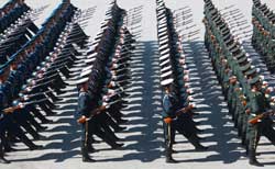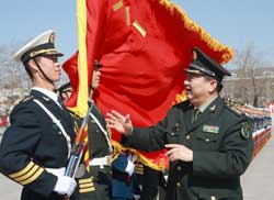 功夫不負(fù)有心人。負(fù)責(zé)閱兵訓(xùn)練的邱巍高將軍,放心不下?lián)?fù)軍旗手的我,有一次他單獨(dú)考核我。那天,我撐著4級(jí)風(fēng)刮得獵獵作響的軍旗,抬腿帶風(fēng),落地砸坑,身后跟隨將軍前來的參謀用鋼卷尺測(cè)量,每一步都是標(biāo)準(zhǔn)的75厘米,將軍滿意地笑了。