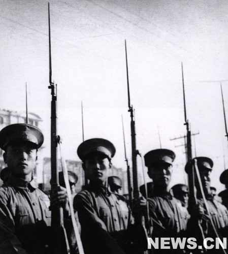 接著前進(jìn)的是民兵大隊(duì)。他們是華北老解放區(qū)民兵的代表,都是戰(zhàn)斗英雄和工作模范,全場(chǎng)熱烈鼓掌向他們表示歡迎。