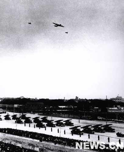 當(dāng)?shù)孛娌筷?duì)經(jīng)過(guò)廣場(chǎng)時(shí),在天空出現(xiàn)了英勇的鐵鷹,兩架殲擊機(jī)護(hù)送著一架領(lǐng)航機(jī)飛在前1954面,接著重轟炸機(jī)、噴氣式轟炸機(jī)和殲擊機(jī),一隊(duì)一隊(duì)地掠過(guò)天安門(mén)上空。