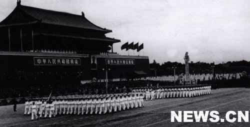 保衛(wèi)著祖國領(lǐng)海的水兵們,通過廣場后,百倍警惕地保衛(wèi)著社會主義建設(shè)的中國人民解放軍公安軍繼續(xù)行進。