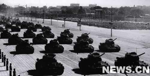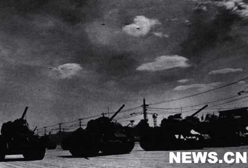 接著,受閱部隊(duì)開(kāi)始分列式。軍事學(xué)院的隊(duì)伍邁開(kāi)整齊的步伐首先走進(jìn)天安門廣場(chǎng)。緊跟在他們后面的是步兵學(xué)校、炮兵學(xué)校、工程兵學(xué)校、坦克學(xué)校、航空學(xué)校、海軍學(xué)校和水兵、公安軍、步兵、摩托化步兵、傘兵的隊(duì)伍。隨后,裝備著各種大口徑遠(yuǎn)射程大炮的炮兵部隊(duì)和威力強(qiáng)大的坦克部隊(duì)相繼通過(guò)了廣場(chǎng)。當(dāng)坦克部隊(duì)在天安門廣場(chǎng)出現(xiàn)時(shí),一隊(duì)隊(duì)噴氣式轟炸機(jī)和殲擊機(jī)風(fēng)馳電掣地飛過(guò)天安門上空。