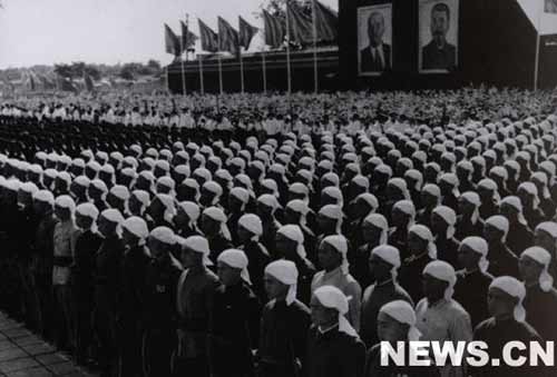 毛澤東主席同他的親密戰(zhàn)友劉少奇、周恩來、朱德、陳云、鄧小平以及黨和國家的其他領(lǐng)導(dǎo)人,在萬眾歡呼聲中,在天安門城樓檢閱了中國人民解放軍和群眾游行隊(duì)伍。