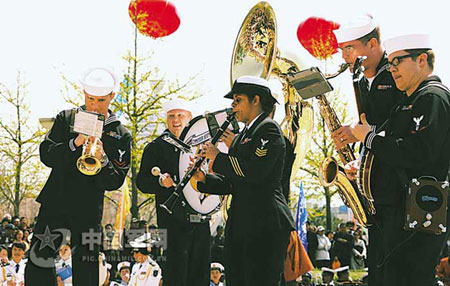 美國海軍派出的7人小樂隊音色韻味十足,一上場,就掀起一陣熱潮。樂手們情不自禁地走到樂池邊,近距離為觀眾演奏了5首樂曲。
