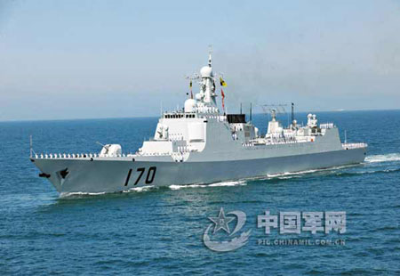 參加海上閱兵的新一代國(guó)產(chǎn)驅(qū)逐艦中,“蘭州”號(hào)導(dǎo)彈驅(qū)逐艦備受世人矚目。該艦舷號(hào)170,是中國(guó)目前最新型的導(dǎo)彈驅(qū)逐艦,在網(wǎng)上被譽(yù)為“中華神盾”。該艦2001年8月在上海江南造船廠開(kāi)工建造,2003年4月下水,2005年8月出廠,2005年9月正式命名加入人民海軍序列。