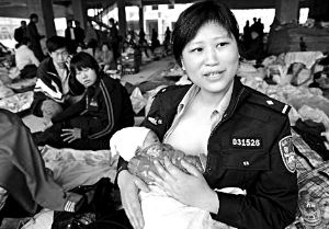 巡邏中的蔣曉娟發(fā)現(xiàn)了急需嬰兒奶粉的告示,還有安置點內(nèi)此起彼伏的嬰兒哭聲。正在哺乳期的她,前兩天已經(jīng)把6個月大的兒子送到了鄉(xiāng)下奶奶家。解開制服,蔣曉娟開始給那些素不相識卻嗷嗷待哺的孩子喂奶。