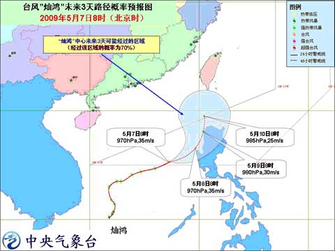 中新網(wǎng)5月7日電 中央氣象臺2009年5月7日10時發(fā)布熱帶氣旋公報:今年第2號強熱帶風(fēng)暴“燦鴻”于今天上午加強為臺風(fēng),上午8時其中心位于東沙群島以南大約590公里的南海中部海面上,就是北緯15.3度,東經(jīng)117.3度,中心附近最大風(fēng)力有12級(35米/秒)。