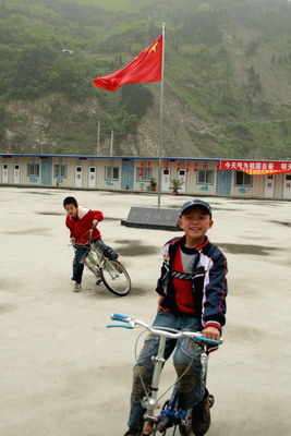 一間板房的山墻上掛著黑板,粉筆寫的“領(lǐng)取傷亡補(bǔ)助的通知”已經(jīng)被雨水沖刷得模糊了!鞍宸砍鲎狻钡男V告和“自救飯店”“家庭旅店”的招牌隨處可見。映秀小學(xué)鑲嵌在居民區(qū)里,大門上的中國(guó)結(jié)、紅燈籠和院子中央鮮艷的紅旗十分醒目。