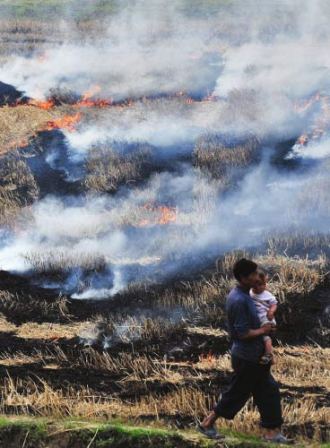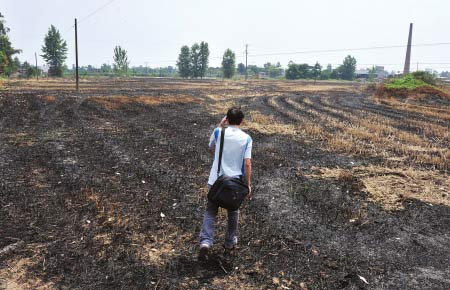 繼續(xù)往北行駛,在前方大約一公里處,一位農(nóng)夫正將一大堆秸稈點燃,燒秸稈的火苗足有半米多高,騰起的濃煙讓高速路上的車輛都放慢了速度。在點燃一堆秸稈后,這名農(nóng)夫又轉身到另一塊農(nóng)田里,點燃堆放在那兒的秸稈……