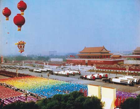 9點(diǎn)多鐘,閱兵式開始,當(dāng)?shù)诙诒疥囉梢慌排艩恳囕d著一枚枚乳白色的導(dǎo)彈出現(xiàn)在天安門廣場時(shí),人們在片刻驚訝之后,突然爆發(fā)出雷鳴般的歡呼聲,人群中有人大喊“二炮,萬歲……”坐著的人站起來了,站著的人跳起來了,天安門廣場沸騰了!
