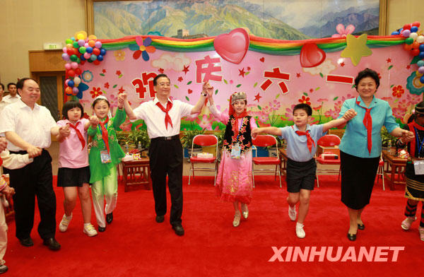 “五十六個民族,五十六朵花……”伴隨著《愛我中華》的樂曲聲,溫總理和孩子們手拉手歡快地跳起舞蹈。
