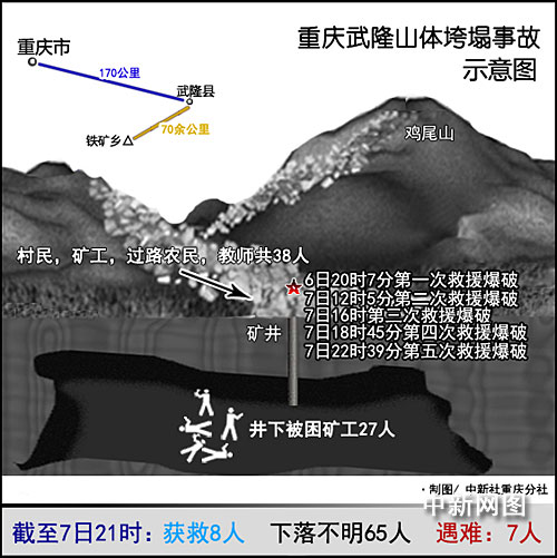 5日下午3時(shí)發(fā)生的重慶市武隆縣鐵礦鄉(xiāng)雞尾山山體垮塌災(zāi)害,直接導(dǎo)致山對(duì)面的三聯(lián)采礦場(chǎng)和幾所民居及一些路人被埋。經(jīng)過兩天兩夜的搜救工作,截至7日23時(shí),救援人員已發(fā)現(xiàn)7位遇難者遺體。包括此前救出的8名傷者和證實(shí)2名失蹤者當(dāng)時(shí)不在事故現(xiàn)場(chǎng)外,尚有65人下落不明,其中,被埋井下有礦工27人。