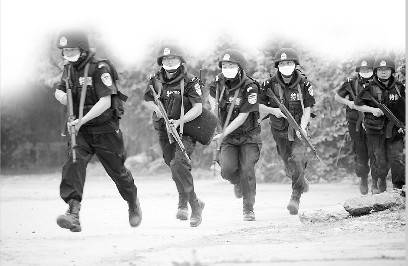 經(jīng)過1小時(shí)的現(xiàn)場處置,當(dāng)?shù)鼐綄ⅰ翱植婪肿印眹?yán)密封控在工廠一區(qū)域內(nèi)。但“恐怖分子”沒有絲毫棄械投降的意思,仍舊挾持人質(zhì)與警方對峙,并威脅炸毀化工設(shè)施。此時(shí),接到報(bào)警的河北省反恐指揮中心迅速啟動省級反恐預(yù)案,成立省級反恐指揮部,并派省級公安特警、武警、消防、衛(wèi)生、氣象和環(huán)保力量,迅速趕往涿州現(xiàn)場增援處置。與此同時(shí),國家也緊急調(diào)派國家反恐應(yīng)急處置力量——— 武警“雪豹突擊隊(duì)”和解放軍“三防醫(yī)學(xué)救援隊(duì)”前往現(xiàn)場增援。