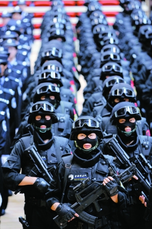 23日,首都舉行國慶安保誓師大會,民警、武警、消防等3000余名代表宣誓,標(biāo)志著國慶60周年安保工作全面啟動。