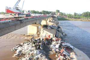李慶生副市長介紹,呼蘭河西大橋橋長187.7米,橋?qū)?5米,是6孔雙幅橋。由于橋齡較長;加之連日大雨,河水沖刷橋體加重,被重車壓塌。呼蘭河西大橋的使用壽命為30年,限重30噸。呼蘭河西大橋在2006年被定為危橋,2007年曾進(jìn)行維修。