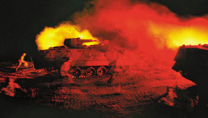 “新大綱規(guī)定,夜訓按照年度訓練總時間20%的比例安排。今年,我們著力提高夜間單兵專業(yè)技能的生成和轉(zhuǎn)化!笔F長話音剛落,伴著隆隆的炮擊聲,夜暗深處火光頻閃。原來,該師新型教練員、二營教導員杜文斌正在組織官兵進行坦克夜間教練射擊課目訓練。眼前景象大出記者意料:目標顯示不再是一盞孤燈,而是以打信號彈、模擬射擊火光和車輛閃爍明滅的燈光等多種方式,大大增加了射擊難度!皵橙松鋼襞诳谝婚W,你能不能馬上回敬一炮?我們練的就是這個!”杜文斌自豪地說。