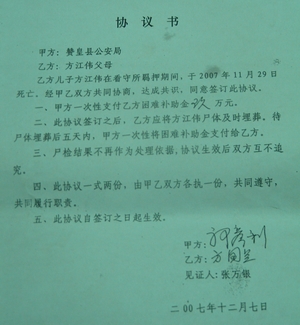7月1日本報(bào)(燕趙都市報(bào))刊發(fā)的《疑犯被逼喝涼水致終身殘疾》如一石擊水,讓"牢頭獄霸"、"躲貓貓"、"喝涼水"再次成為社會(huì)關(guān)注的焦點(diǎn)。而令人震驚的是,在調(diào)查秦英偉"喝涼水"致殘案過程中,本報(bào)記者又有驚人發(fā)現(xiàn):同是贊皇縣看守所,2007年4月至11月半年多時(shí)間內(nèi),兩個(gè)在押疑犯暴斃,最后都由當(dāng)?shù)毓膊块T出錢"協(xié)商解決",一位死者家屬給了"困難補(bǔ)助金"9萬元,另一位死者的家屬給了1.5萬元。