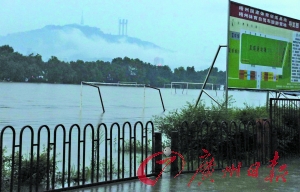 被譽為中國足球“明星搖籃”和培養(yǎng)中國足球裁判員“黃埔軍!钡膹V西梧州體育訓練基地,位于緊臨西江的梧州市蝶山區(qū)龍湖鎮(zhèn),是原國家體委與地方共建的全國三大足球訓練基地之一。前日以來,隨著西江水位的不斷上漲,該體育訓練基地開始不斷被水蔓延。昨日下午,記者趕到時,上百畝訓練場地全部被大水淹沒,水深處達兩米多,球場只露出一截40多個球門,讓人們還能認得出來這里原來是一處足球場地。同時,記者也看到附近居民的房屋的一樓已經(jīng)泡在水中。(記者王廣永)