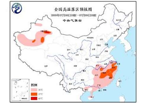 中新網7月8日電 中央氣象臺8日18時繼續(xù)發(fā)布高溫預報:預計,明天(9日)白天,新疆北疆南部和南疆盆地、湖北東部、江南大部、華南中東部等地有35℃ 以上的高溫。