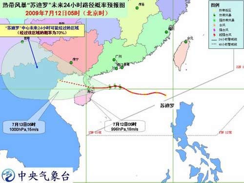中新網(wǎng)7月12日電 中央氣象臺今日早晨6時發(fā)布臺風(fēng)橙色警報:今年第5號熱帶風(fēng)暴“蘇迪羅”( SOUDELOR )的 中心已于12日早晨5時30分在海南文昌北部沿海登陸,登陸時中心附近最大風(fēng)速為18米/秒,中心最低氣壓994百帕。