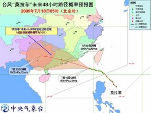 該警報顯示,今年第6號強(qiáng)熱帶風(fēng)暴“莫拉菲”(MOLAVE)已于18日凌晨進(jìn)入南海東北部海面,隨后于早晨5時加強(qiáng)為臺風(fēng)。18日早晨5時其中心位于廣東省惠東縣東偏南方大約450公里的海面上,就是北緯21.2度、東經(jīng)119.0度,中心附近最大風(fēng)力有12級(33米/秒)。