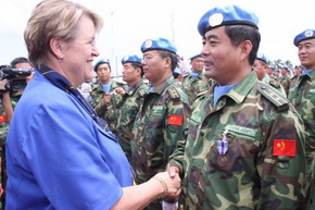 洛伊感謝中國政府一貫積極支持聯(lián)合國維和行動(dòng),為維護(hù)世界和平與安全做出了重要貢獻(xiàn)。她引用老子《道德經(jīng)》中“慈,故能勇”、“天下大事,必作于細(xì)”等名句,贊揚(yáng)中國維和部隊(duì)風(fēng)紀(jì)嚴(yán)明、愛護(hù)百姓,祝賀他們圓滿完成維和使命。