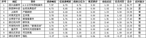 說明:本表數(shù)據(jù)為11位輿情分析師采用德爾菲法,對地方政府應(yīng)對網(wǎng)絡(luò)輿情表現(xiàn)進(jìn)行分項(xiàng)評估后得出。其中政府響應(yīng)、信息透明度、政府公信力三項(xiàng)為常規(guī)指標(biāo),分值區(qū)域分別為-10~10分;恢復(fù)秩序、動態(tài)反應(yīng)、官員問責(zé)三項(xiàng)為特殊指標(biāo),分值區(qū)域分別為-5~5分、-3~3分、-3~3分。輿情分析師依據(jù)以上各項(xiàng)指標(biāo)對政府表現(xiàn)分別做出評價(jià),政府表現(xiàn)越出色、應(yīng)對越得體則得分越高,反之則得分越低。最終依據(jù)各項(xiàng)表現(xiàn)綜合所得總分,得出藍(lán)、黃、橙、紅四級警報(bào)級別,警報(bào)程度相應(yīng)由低到高。其中總分20.00分以上為藍(lán)色警報(bào),政府應(yīng)對總體較為得體;總分15.00~19.99分為黃色警報(bào),政府應(yīng)對有待進(jìn)一步加強(qiáng);總分10.00~14.99為橙色警報(bào),政府應(yīng)對存在明顯問題;總分10.00分以下為紅色警報(bào),政府應(yīng)對嚴(yán)重失當(dāng),存在重大缺陷。
