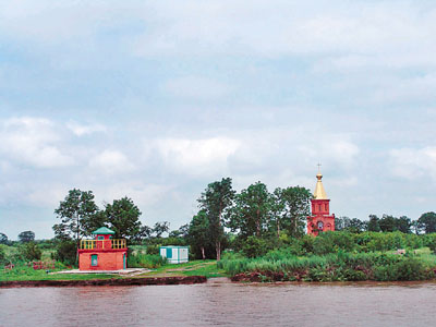 隨著輪船一聲氣笛,黑瞎子島已近在眼前,最先進(jìn)入記者視線的是黑瞎子島上的標(biāo)志物——俄羅斯小教堂,其金碧輝煌的穹頂,非常醒目。