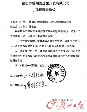 這名網(wǎng)友提供了部分圖片證據(jù),從圖上能看到,在2007年12月21日簽署的鞍山碧湖園房屋開(kāi)發(fā)有限公司股權(quán)轉(zhuǎn)讓協(xié)議上,出讓方簽名付維強(qiáng),受讓方簽名為傅維強(qiáng)。網(wǎng)帖還貼出當(dāng)?shù)嘏沙鏊_(kāi)具的證明,證實(shí)付維強(qiáng)在2006年2月21日改名為傅維強(qiáng)。