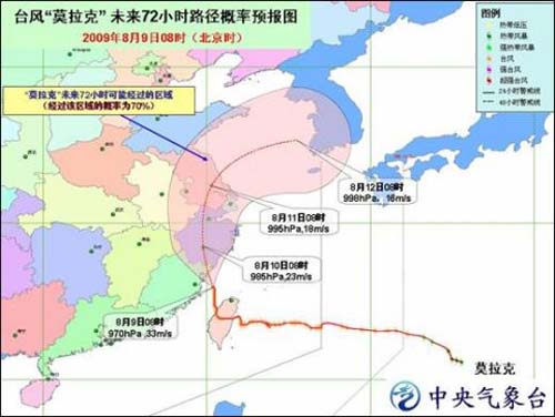 中新網(wǎng)8月9日電 據(jù)中國氣象局網(wǎng)站消息,中央氣象臺8月9日上午發(fā)布臺風(fēng)紅色緊急警報(bào):今年第8號臺風(fēng)“ 莫拉克 ” (MORAKOT )的中心今天上午8時(shí)位于福建省霞浦縣南偏東方大約90公里的海面上,就是北緯25.9度、東經(jīng)120.4度,中心附近最大風(fēng)力有12級(33 米 / 秒),中心最低氣壓970百帕 。
