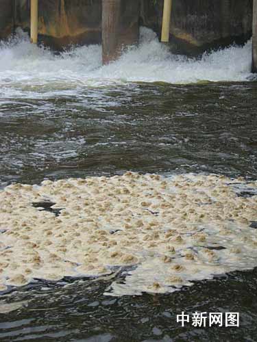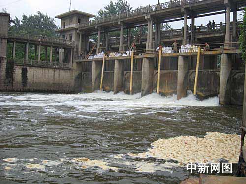 中新社徐州八月九日電 (邵國(guó)棟)記者今天來到受嚴(yán)重砷污染的江蘇省邳州市邳城鎮(zhèn)城河節(jié)制閘現(xiàn)場(chǎng),十余名工人正在閘站上往河道里投放一種黃色的粉末。工人稱這種叫三氯化鐵的化學(xué)物質(zhì)主要用來降低水體砷化物濃度,他們已經(jīng)在此晝夜堅(jiān)守多日。