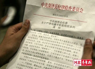 記者了解到,深澤縣委常委、紀(jì)委書記張慶民是此事的主要推動者之一。在他們的推動下,經(jīng)多次討論,并向深澤縣委多次匯報(bào)后,才出臺了“嚴(yán)禁傳播手機(jī)低俗信息的通知”。