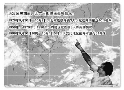 歷次國慶期間,北京曾經(jīng)出現(xiàn)過幾次大雨和連續(xù)性降雨:1976年9月30日—10月2日,北京連續(xù)降雨3天,過程降雨量達40.5毫米;1959年、1979年和1996年也出現(xiàn)過連續(xù)3天降雨的情況;1999年國慶50周年前夜,北京出現(xiàn)降雨,一直持續(xù)到10月1日早晨。9月30日16時到10月1日5時,天安門地區(qū)的降水量為31毫米,給國慶活動的前期準備工作造成了影響。