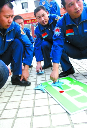“注意飛行高度,準(zhǔn)備下降”,劉國(guó)勝和其他飛行員每人手持一個(gè)微型的戰(zhàn)斗機(jī)模型,在一塊空曠的場(chǎng)地上按照飛行編隊(duì)站好,從“起飛”開(kāi)始全程模擬了一遍“空中受閱”的經(jīng)過(guò)。