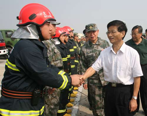 在北京通州閱兵村,孟建柱實地查看了安全警衛(wèi)設(shè)施,親切看望慰問了安保工作人員,聽取了閱兵活動安保工作匯報。孟建柱對這里實行的軍警民三結(jié)合聯(lián)防安保工作機(jī)制給予了肯定。
