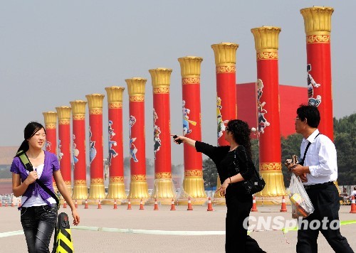 相關(guān)人士透露,民族團(tuán)結(jié)柱作為六十周年國(guó)慶慶典的背景,在國(guó)慶過(guò)后將撤離出天安門(mén)廣場(chǎng),可能供收藏,也可能會(huì)安放到中華民族園供游客觀賞。完