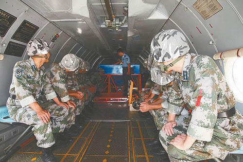 執(zhí)行空中撒播催化劑任務的是空降兵某團的特種兵們,他們曾多次從這種型號的運輸機上練習跳傘,但這次的任務是在規(guī)定時間內(nèi),快速將消云減雨的催化劑播撒完畢。