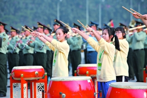 昨日下午3點(diǎn)開始,聯(lián)合軍樂團(tuán)和合唱團(tuán)、民族打擊樂團(tuán)共4000余人在聯(lián)合軍樂團(tuán)駐地進(jìn)行了合練。記者在現(xiàn)場看到,廣場樂聲悠揚(yáng),氣氛熱烈。一些大學(xué)生合唱團(tuán)成員從各自高校乘大巴趕至郊外,有些學(xué)生暈車剛吐完就上場加入合練。