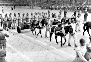 緊跟海軍方隊(duì)的,是由8000多人組成的12個(gè)步兵方隊(duì)。除了3個(gè)建制步兵團(tuán),步兵方隊(duì)還包括臨時(shí)編組的沖鋒槍、輕機(jī)槍、通信、重機(jī)槍、輕迫擊炮、重迫擊炮、戰(zhàn)防炮、山炮各1個(gè)營。