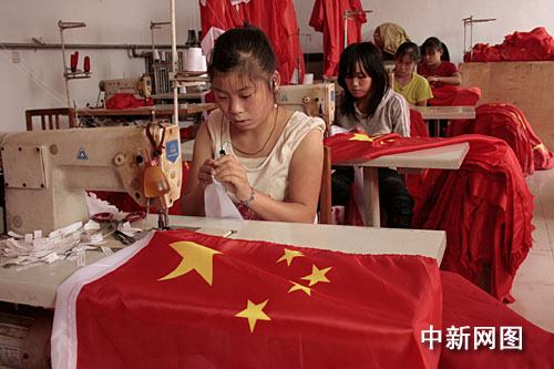 “哈爾濱、沈陽、烏魯木齊、長沙、武漢、廣州、合肥、鄭州的批發(fā)市場上都有我們廠生產(chǎn)的國旗,今年訂單最多的是成都和烏魯木齊,我們廠一半以上的國旗都發(fā)往那里。”藁城市燦爛星光旗幟廠廠長蘇振國告訴記者。