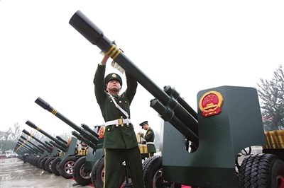 當天上午9時30分,武警北京總隊某部京郊某訓練場。秋雨剛過,訓練場上的60門禮炮(其中4門為預(yù)備炮)著新刷不久的綠漆,雁翅分開,昂然而立。9時40分左右,“就炮!”隨著一聲口令,百余名武警戰(zhàn)士兩人一組站到禮炮后面。