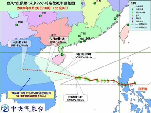 預(yù)計,“凱薩娜”將以每小時15公里左右的速度向西偏北方向移動,強度還將有所加強,并逐漸向海南南部沿?拷,將于29日經(jīng)過海南南部近海后,向越南中北部沿海靠近。