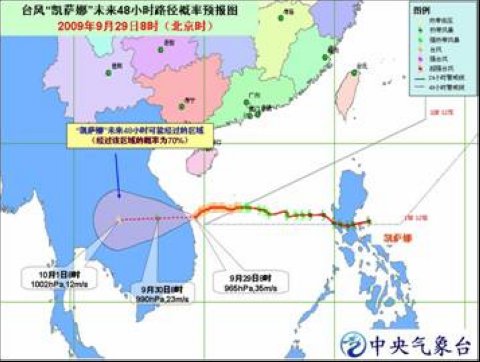 “凱薩娜”的中心29日10時(shí)位于越南廣義省以東大約40公里的南海西部海面上,就是北緯15.4度、東經(jīng)109.2度,中心附近最大風(fēng)力有12級(jí)(35米/秒),中心最低氣壓為965百帕。