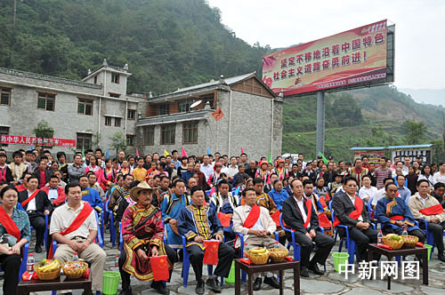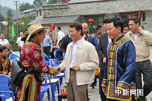 當(dāng)日的涼風(fēng)埡卓卓羌寨,處處洋溢著歡樂祥和的喜慶氣氛:羌族群眾身著節(jié)日盛裝喜形于色,孩子們手持小國旗歡快地嬉戲,羌寨廣場上正在舉行“建國60周年圖片展”……。上午9時(shí)40分,當(dāng)李崇禧、歐澤高、吳靖平、曾萬明等省市領(lǐng)導(dǎo)來到羌寨廣場時(shí),熱情好客的羌族群眾紛紛圍上去向他們獻(xiàn)上羌紅。李崇禧關(guān)切地向老鄉(xiāng)們?cè)儐枮?zāi)后重建進(jìn)展及當(dāng)前生產(chǎn)生活情況,他飽含深情地說:“今天是偉大祖國60歲的生日,受省委書記劉奇葆同志、省長蔣巨峰同志的委托,我們專程來看望大家,并和大家一起過節(jié)。”