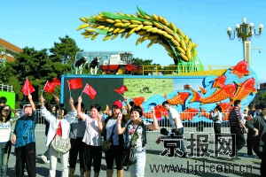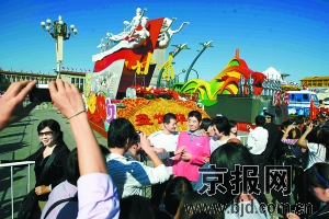 今天上午8時(shí)30分,60臺(tái)國(guó)慶彩車在天安門廣場(chǎng)亮相,開(kāi)始進(jìn)行為期6天的集中展示,開(kāi)放時(shí)間比原計(jì)劃提前了一個(gè)半小時(shí)。在兩小時(shí)時(shí)間內(nèi),數(shù)萬(wàn)市民和游客涌入廣場(chǎng)參觀,爭(zhēng)相與彩車合影,國(guó)慶彩車當(dāng)之無(wú)愧地成為今天的廣場(chǎng)明星。