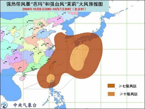 受“茉莉”和南下冷空氣的共同影響,6日夜間至7日白天,東海大部、黃海南部將有7-8級大風(fēng),陣風(fēng)可達(dá)9-10級,其中東海東部將有9-10級大風(fēng),陣風(fēng)可達(dá)11-13級。